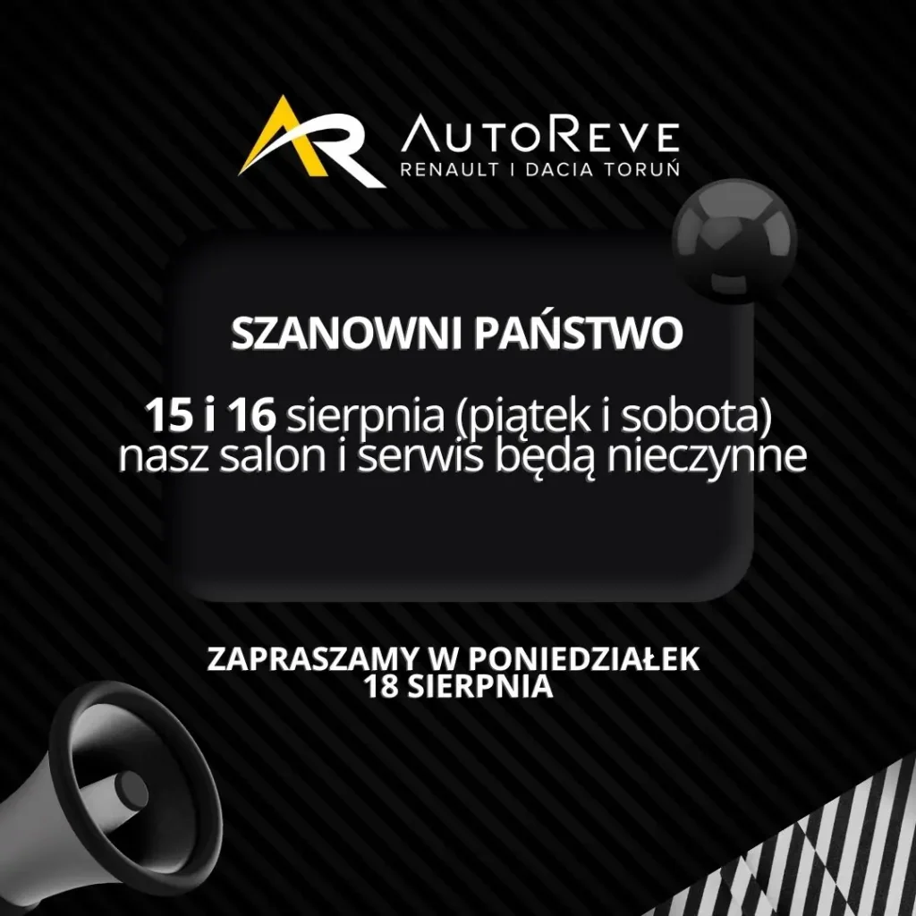 Witajcie w Auto Reve – firmie z Torunia, która już od ponad 20 lat zajmuje się sprzedażą samochodów nowej generacji marki Renault i Dacia. Nasza firma to miejsce, w którym doświadczenie i profesjonalizm spotykają się z najnowszymi technologiami, dzięki czemu zawsze dostarczamy Klientom najlepsze rozwiązania. Od początku naszej działalności stawiamy na najwyższą jakość obsługi i produktów, co przekłada się na zadowolenie naszych Klientów. W ofercie naszej firmy znajdują się nie tylko samochody nowe, ale także auta z outletu oraz usługi serwisowe, dzięki czemu nasza firma to kompleksowe rozwiązanie dla każdego. Nasza kadra to zespół profesjonalistów, którzy zawsze chętnie pomogą i doradzą. Zapraszamy do współpracy i do odwiedzenia naszej siedziby w Toruniu.